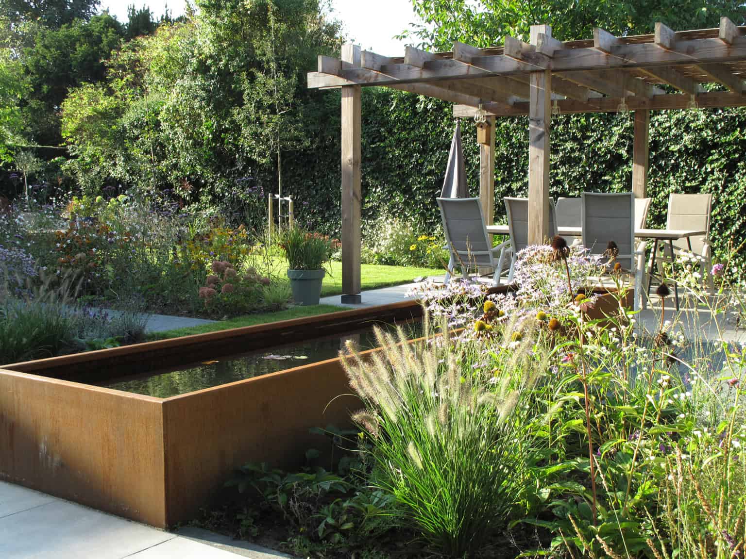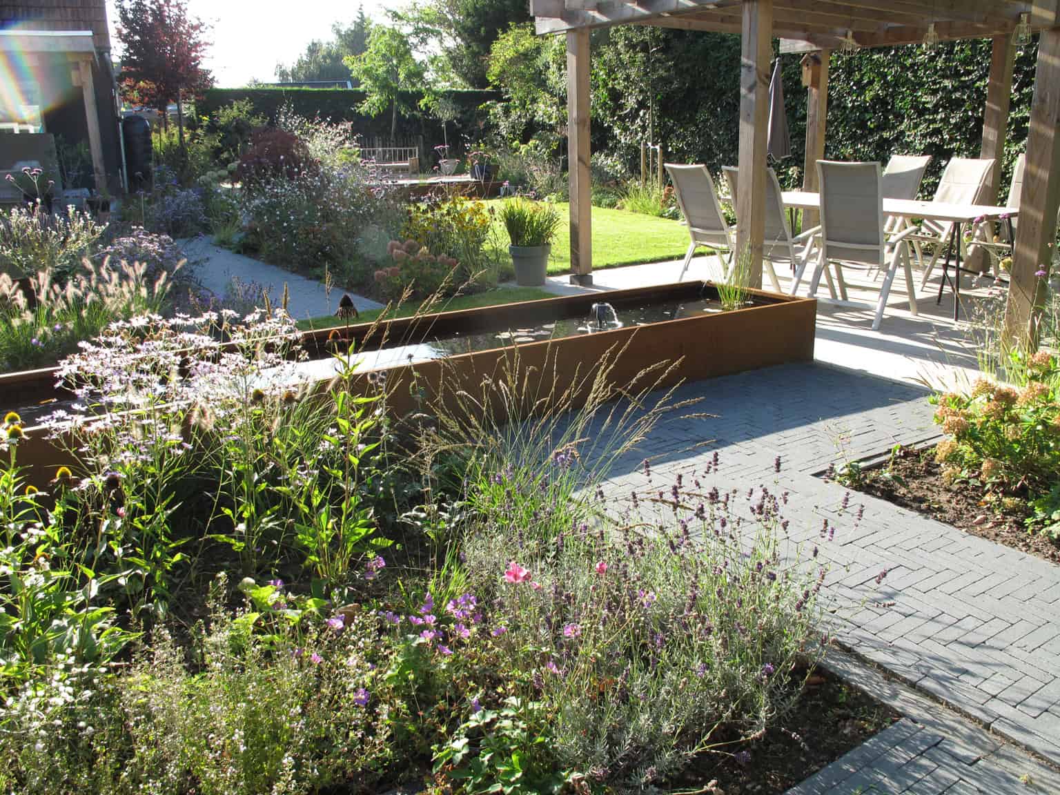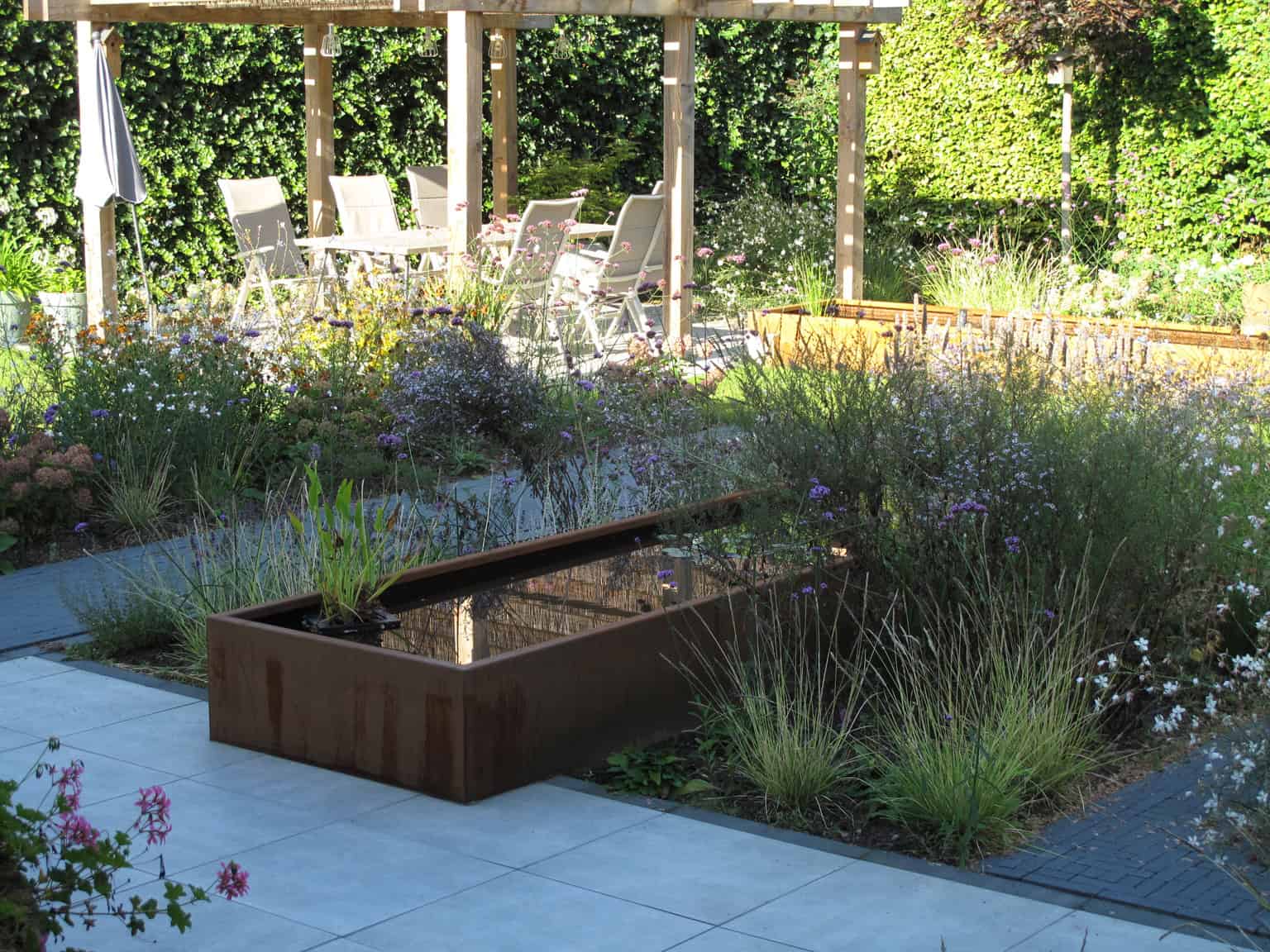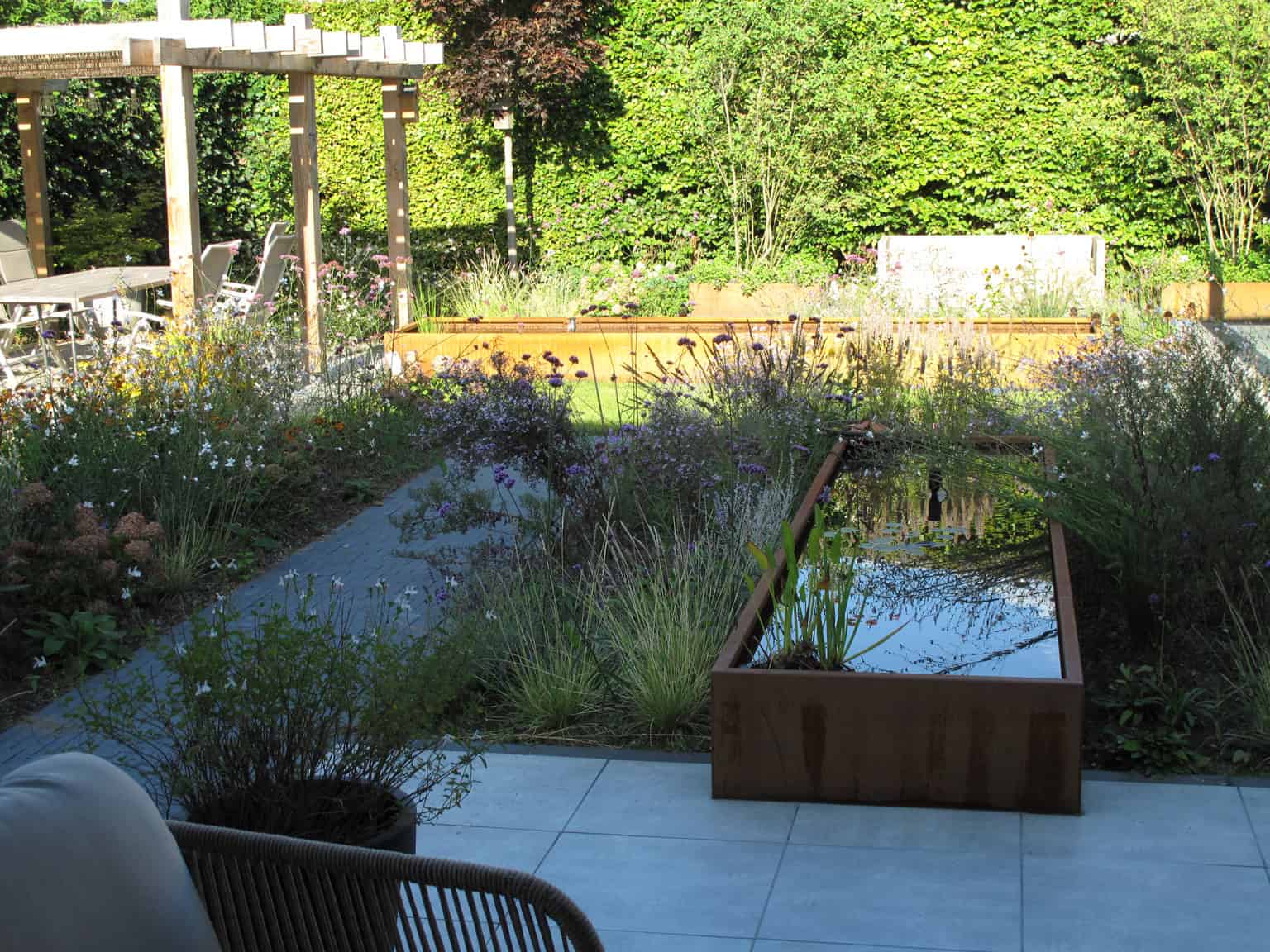 450 m2, Westervoort; 3 lange en hoge cortenstalen waterbakken domineren de tuin, elke waterbak is gekoppeld aan een terras, het cortenstaal mengt mooi met de weelderige en kleurrijke beplanting er omheen, een gazon geeft rust als tegenhanger van de uitbundigheid