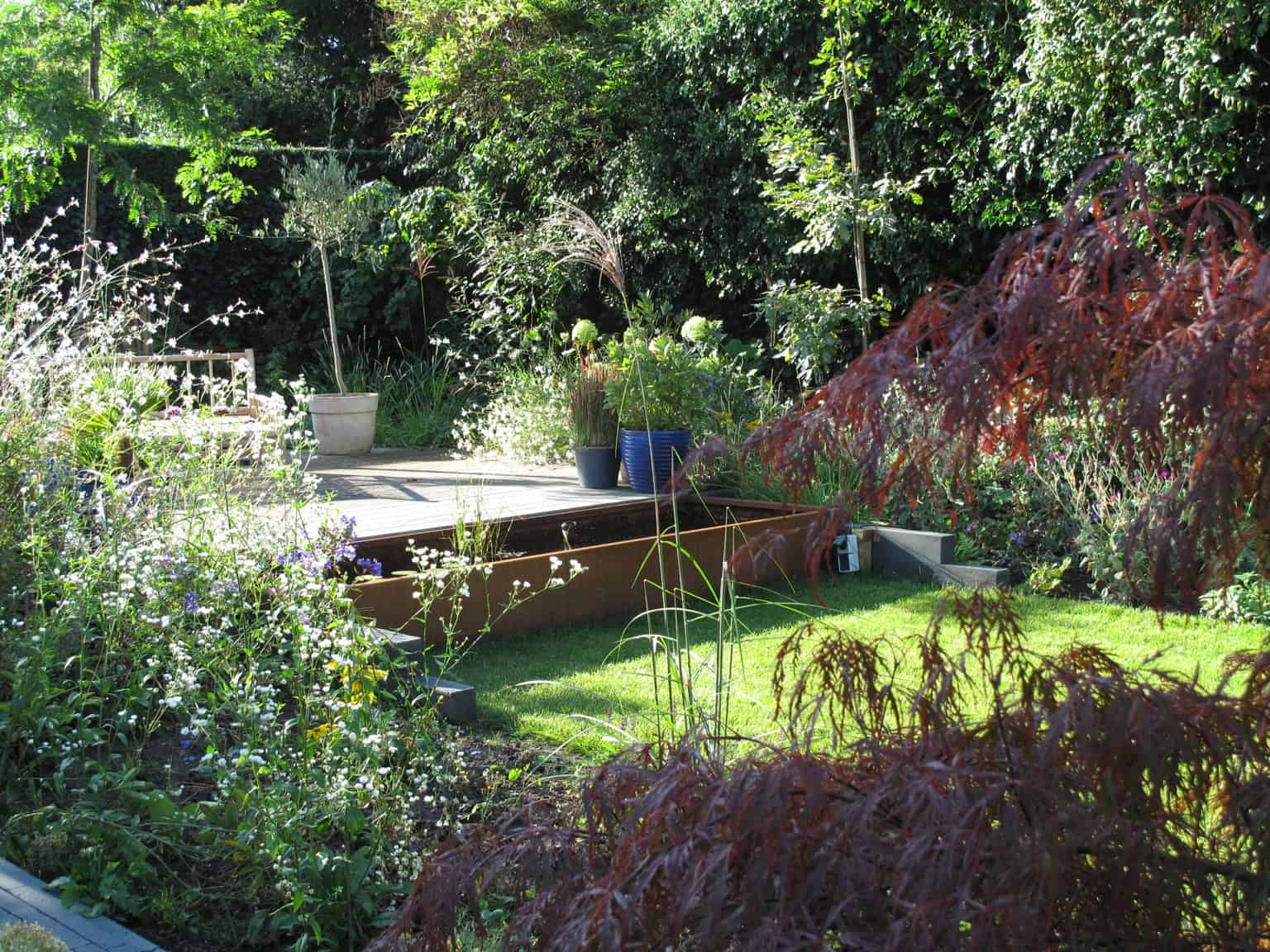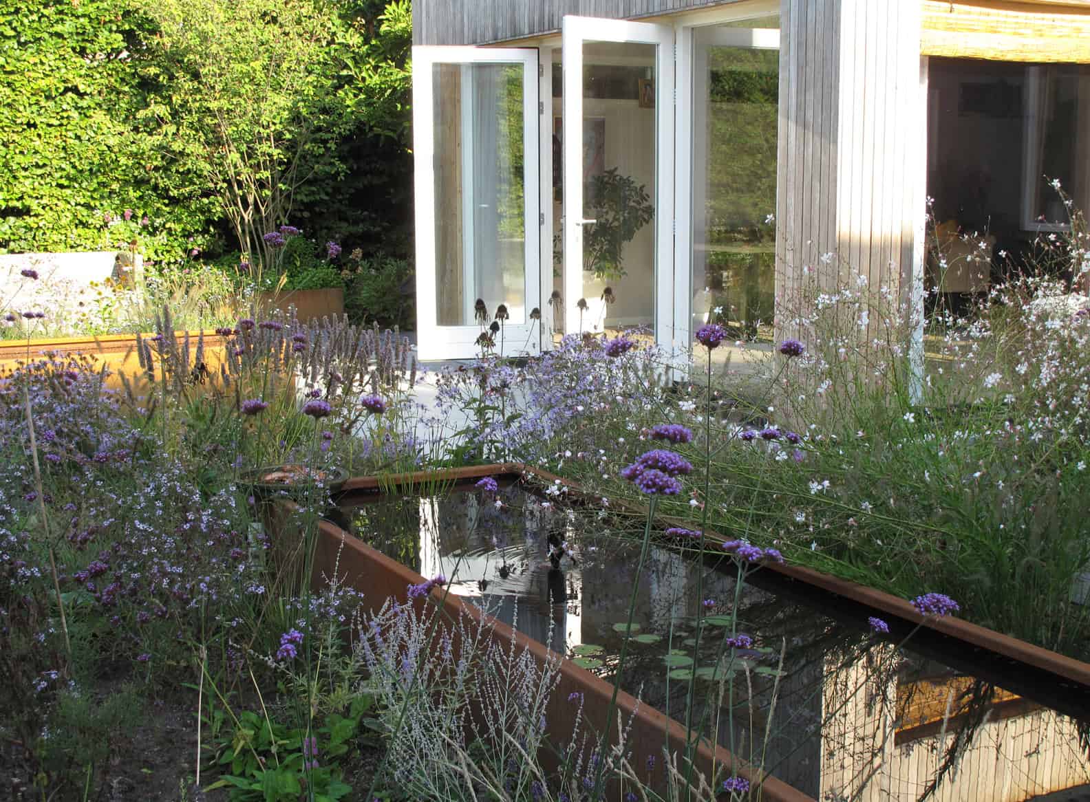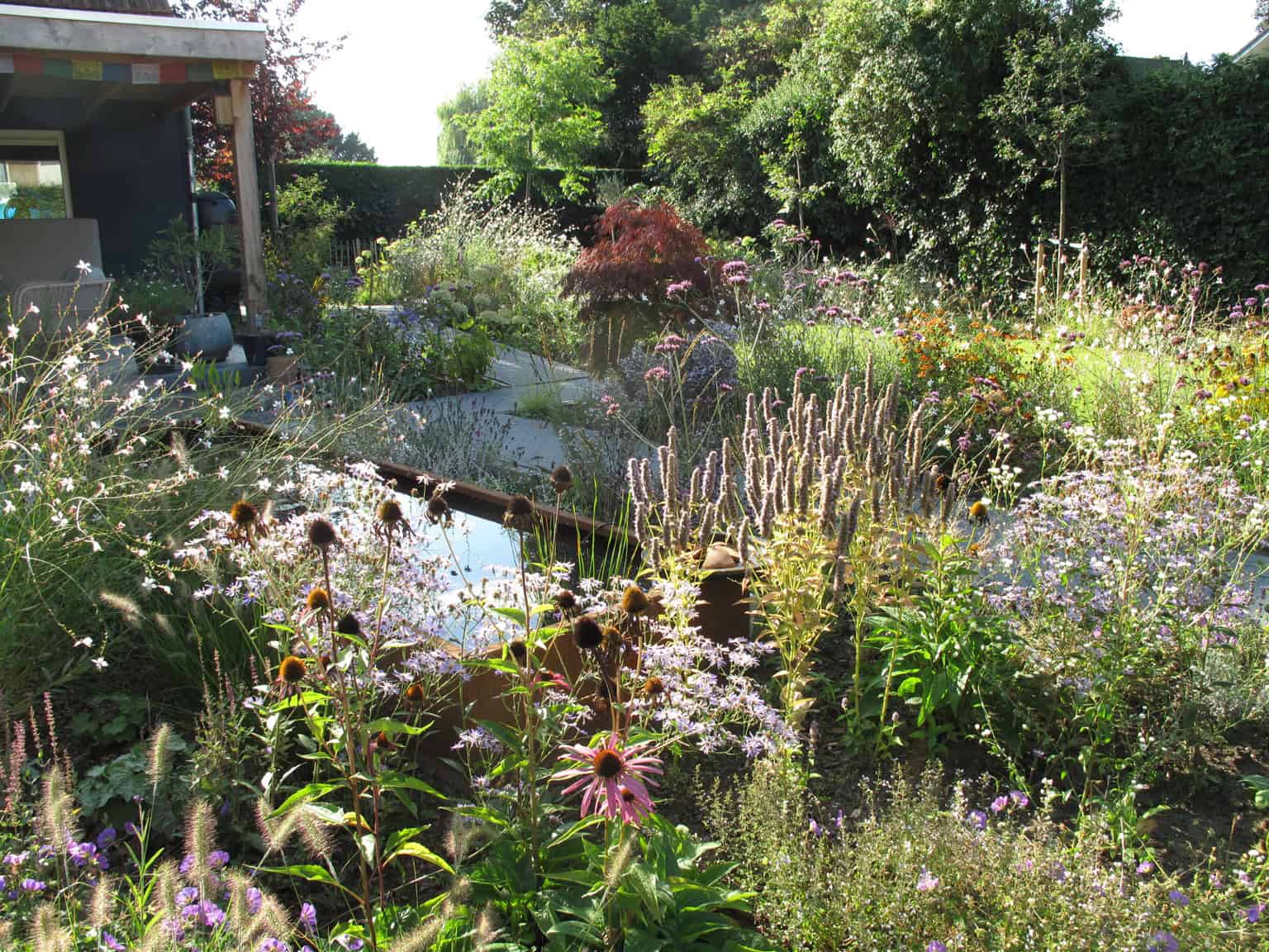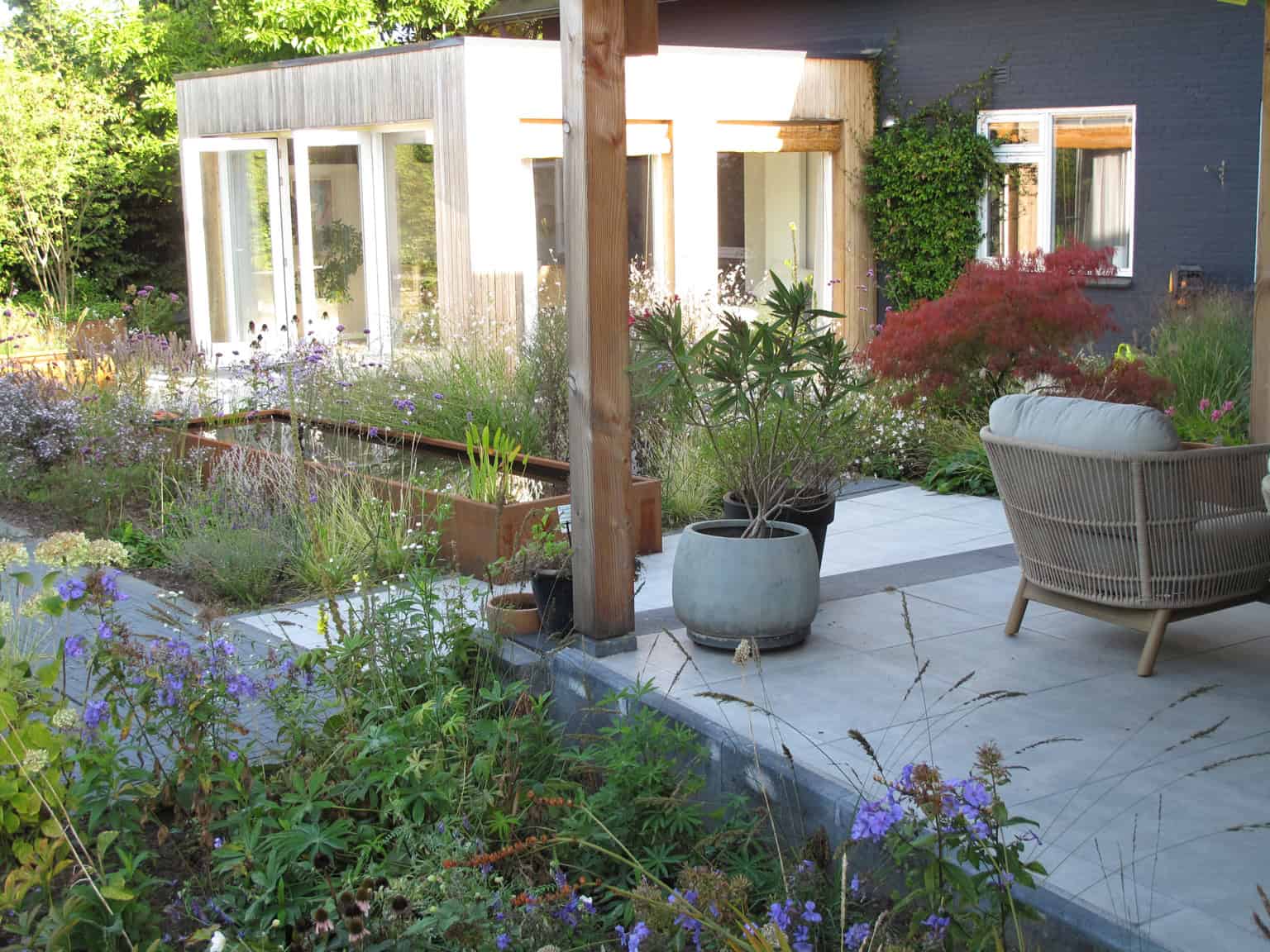 450 m2, Westervoort; 3 lange en hoge cortenstalen waterbakken domineren de tuin, elke waterbak is gekoppeld aan een terras, het cortenstaal mengt mooi met de weelderige en kleurrijke beplanting er omheen, een gazon geeft rust als tegenhanger van de uitbundigheid
