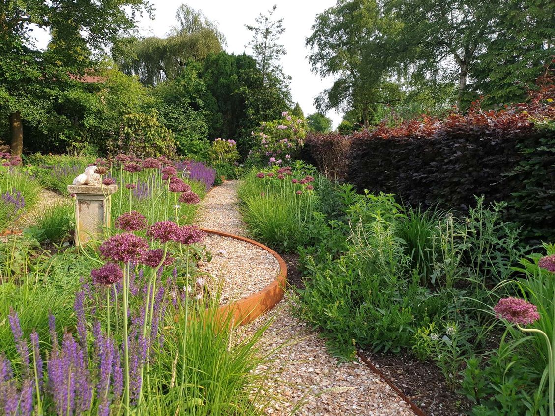 335 m2, Malden; Plantentuin, volgens Oudolf principes ontworpen. Veel vlinders en bijen. De planten zijn te beleven via een padenstructuur waarin 3 verhoogde cirkelvormige pleintjes als rustplekken zijn opgenomen, deze zijn uitgevoerd in cortenstaal. De belangrijkste planten voor de structuur in de beplanting en voor de bloeispreiding over alle seizoenen: Salvia, Sedum, Sesleria en Allium.